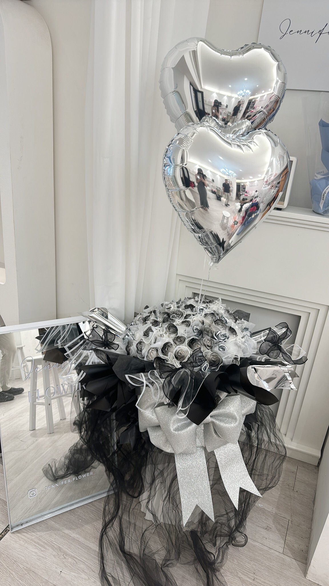 99朵 黑漸變黑銀 黑銀大芭比花束 銀大蝴蝶結 桃園店